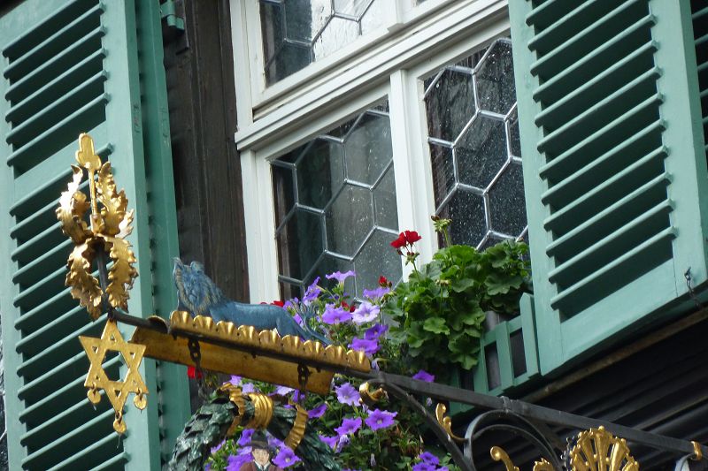 Wir gehen zwei Ecken weiter und stehen vor der alten Hof-Apotheke. Das Gebäude in der Karolinenstraße 17 gilt als das älteste Gebäude der Stadt.