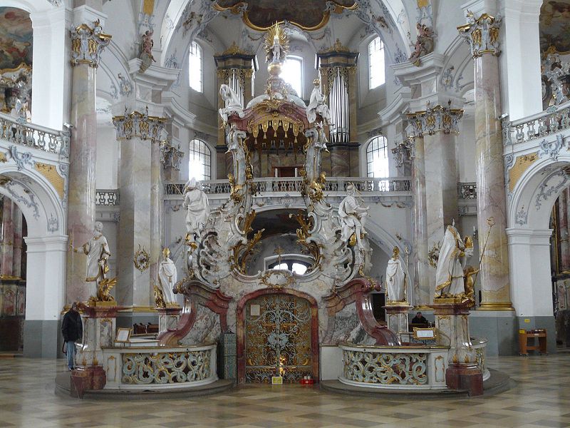 Das Zentrum des Raumes bildet der Gnadenaltar. Der Platz der Erscheinungen, der heilige Ort, ist doppelt überwölbt - einmal durch den Baldachin, neben und auf dem die Skulpturen der Nothelfer gruppiert sind und zum anderen durch die größte Kuppel. Zwölf der vierzehn Nothelfern sind am Gnadenaltar, nach den vier Himmelsrichtungen ausgerichtet, in drei Etagen übereinander angebracht. Barbara und Katharina stehen an den beiden seitlichen Altären.
