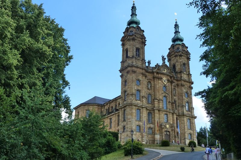 Es dient als Tagungsstätte und kann nur mit einer angemeldeten Führung besichtigt werden. Die werden wir um 13 Uhr bekommen. Davor umrunden Toni und ich zuerst die äußerlichen Ansichten und die Kirche. Die Klosterkirche von Banz trägt das Patrozinium St. Dionysius und St. Petrus. Die berühmte Kirche, deren Grundstein 1710 gelegt wurde, ist schon durch die geschickte Ausnutzung der landschaftlichen Lage und durch die Gestaltung des Außenbaus mit einer hochragenden Doppelturmfassade von weitem als Meisterwerk zu erkennen.
