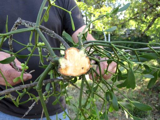 Über ihre Wurzeln zapft sie die Leitungsbahnen der Bäume an, auf denen sie siedelt. Die befallenen Bäume leiden unter der Mistel und können partiell oder ganz absterben. Bei starkem Entzug von Nährstoffen und Wasser durch eine erhöhte Anzahl von Misteln, verringert sich die Vitalität des Baums. Er wird also geschwächt und Äste können brechen. Im Einzelfall muss entschieden werden, ob ganze Äste aus dem Baum heraus geschnitten werden oder ob ein regelmäßiges abreißen der Mistel genügt. Es gibt kein chemisches Mittel gegen die Mistel. Die Wurzeln der Mistel treten links und rechts von ihrer Austrittsstelle am Ast auf, diese gilt es zu beseitigen. Schon jüngere Bäume sollten öfter kontrolliert und ausgeschnitten werden. Ein gepflegter Baum wird somit weniger von Misteln befallen. Nicht die Mistel ist das eigentliche Problem, sondern die oft fehlende Obstbaumpflege in Streuobstwiesen. Dieses Jahr sei auch wegen der geringen Obsternte für die Mistel ein günstiges Jahr gewesen, da die Bäume nicht so viele Nährstoffe für ihre Früchte aufwenden mussten, blieb mehr für den Halbschmarotzer übrig.